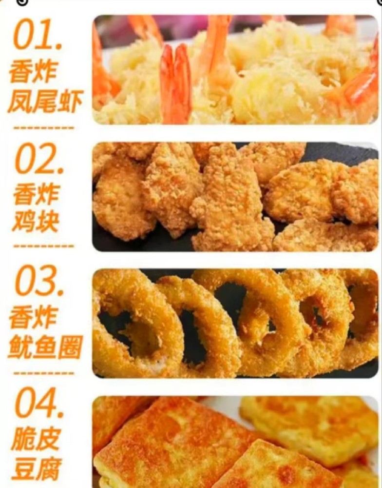 菜式:香炸凤尾虾、香炸鸡块、香炸鱿鱼圈、脆皮豆腐